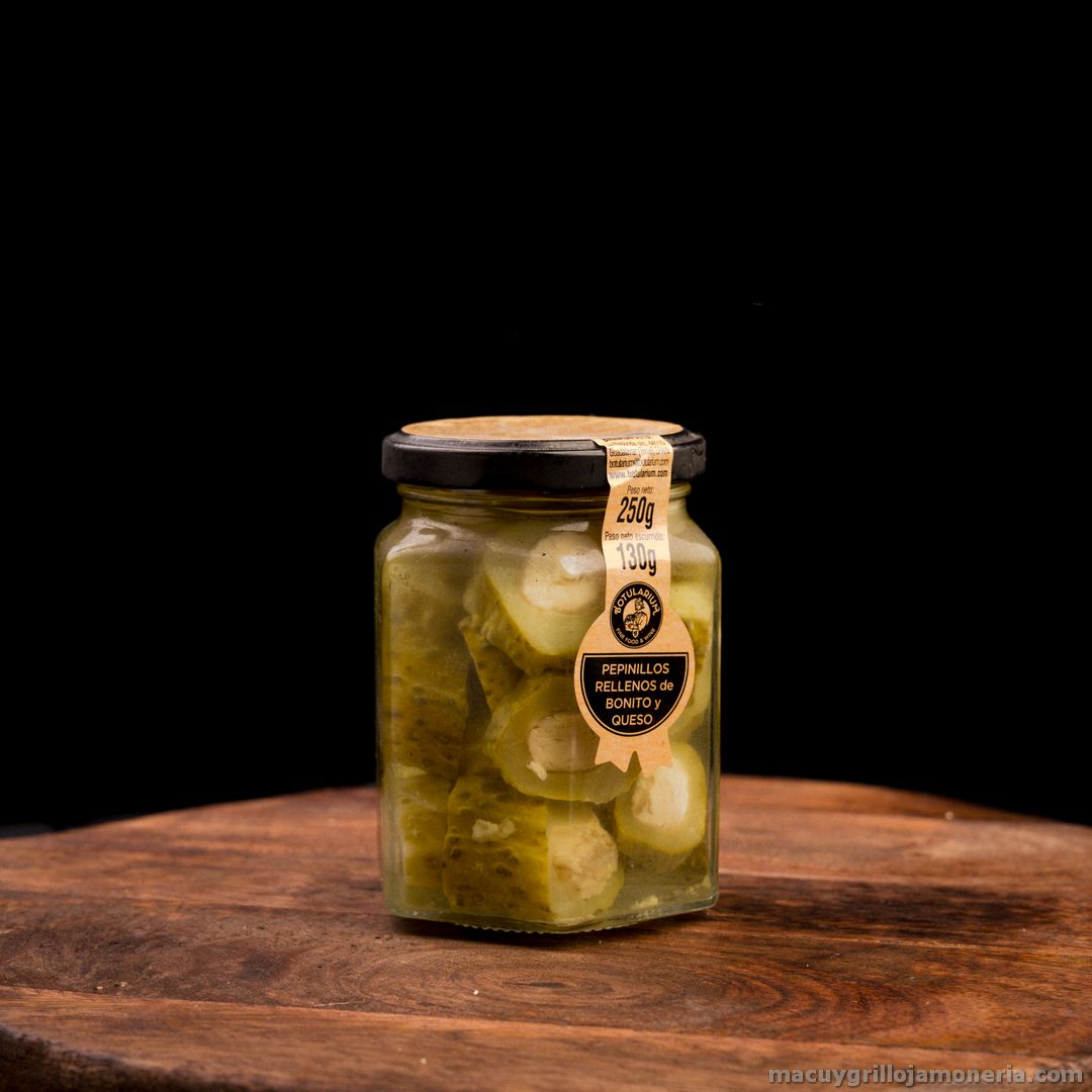 Los Pepinillos Rellenos son un aperitivo clásico y delicioso, perfectos para disfrutar en cualquier momento. Cada pepinillo conserva su frescura y textura crujiente, mientras que el relleno de bonito y queso aporta suavidad, sabor y un toque gourmet.