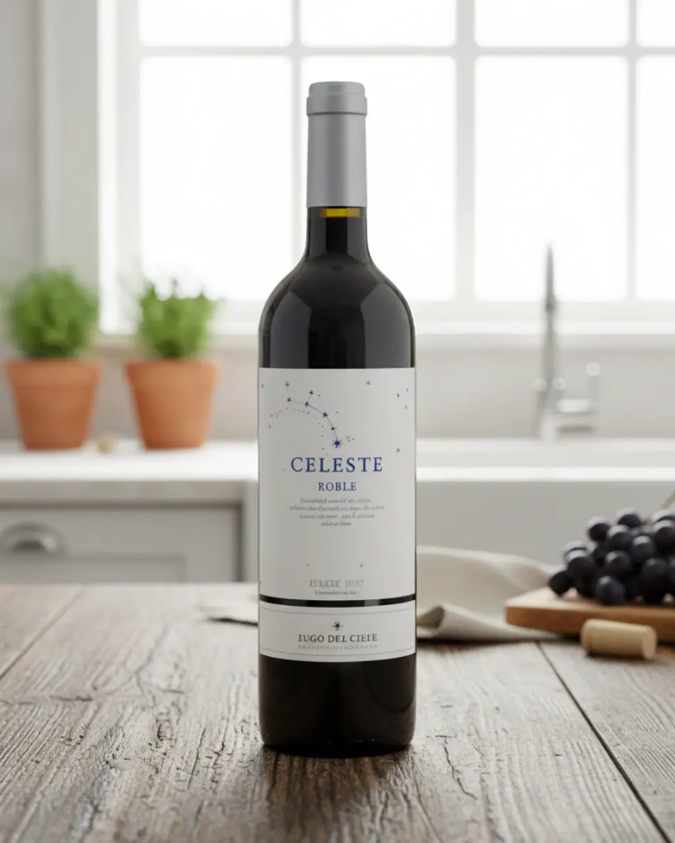 A la vista, se presenta con un intenso color rojo cereza y reflejos violáceos que anuncian su juventud y vitalidad. En nariz, el Vino Celeste Roble despliega aromas de frutos rojos maduros, como cereza y frambuesa, combinados con notas delicadas de vainilla, cacao y especias dulces procedentes de la madera. Este contraste entre fruta y madera lo convierte en un vino aromáticamente rico y envolvente.